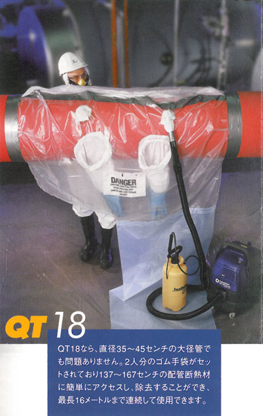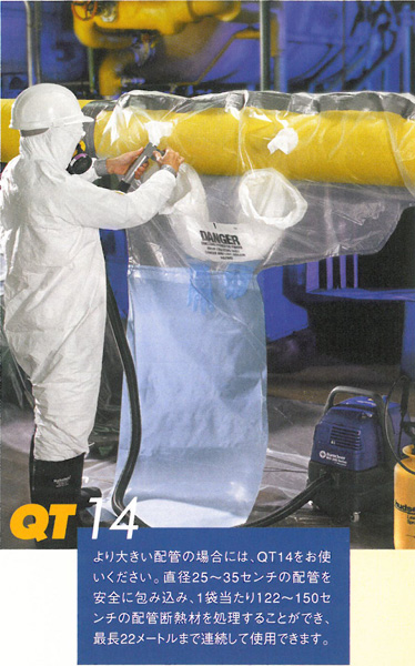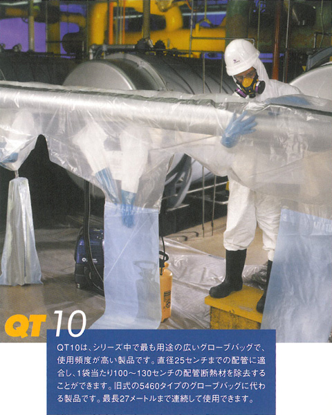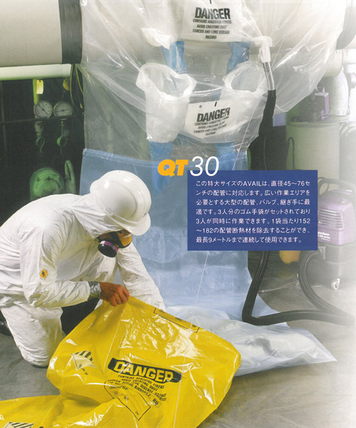 米国・グレイリング社の「AVAIL QuickTwist グローブバッグ」は、配管に使用されているアスベスト除去工事に於いて、最も使用実績が高く、使いやすく、安全な方法であると云う評価が定着しており、他のどの製品よりも多くの専門家に選ばれています 5,000万フィート(約15,240km)に上る配管断熱材の除去に使用されてきました。断熱材の除去作業部分と、除去した廃棄物を隔離する部分との、2つの空間を備えた「QuickTwist」シリーズの登場でさらに進歩を遂げました。 「QuickTwist」は除去作業部分が広く、困難な場所でも作業しやすくなっており、除去された配管断熱材を入れる廃棄袋は、十分な長さの設計になっているため簡単にねじって切り離す事が出来ます。廃棄袋の素材は、PHDポリマーの採用により、どのグローブバッグよりも刺し傷や断裂に対する強度が強くなっています。