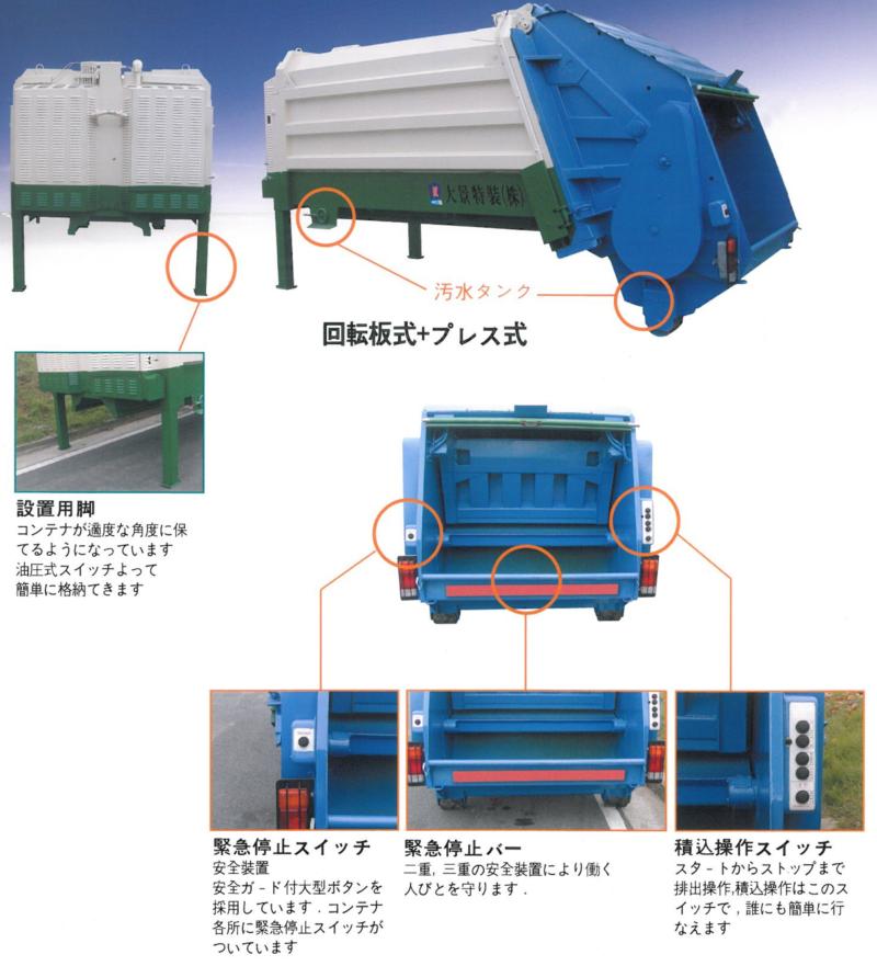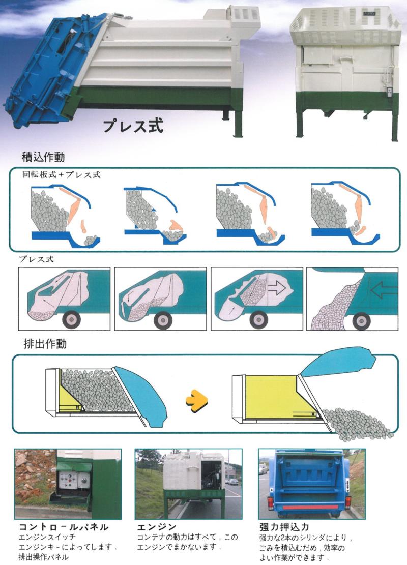 通常の4~7トンアームロールトラックで積み下ろし・移動が可能で設置が迅速に行えます、設置後も内臓のディーゼルエンジンで稼働し外部電源を必要とせず迅速で低コストなゴミ収集が可能となります。 緊急停止スイッチ、緊急停止バー、操作スイッチなど各種安全機構を装備、作業の高利率化と安全性能を高めました。
